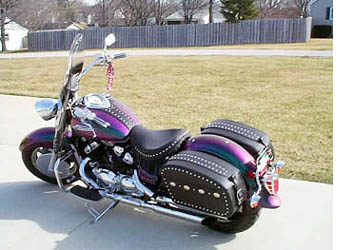 Scoop says, "This bike started out as a black and tan '97 Tour Classic. Added California beach bars and Head Winds headlamp with ballast light inside from Baja Designs. Soloed out with a Corbin fringed seat. Paint is Dupont's Cromalusion (Absolute Purpleen) by ISRA's own Benny Bryant. Many other little chrome goodies to make it my own."