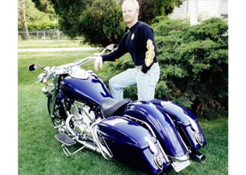 Todd Becker (Wichita Kansas) says this is a " '98 Royal Star Tour Deluxe with 17,000 miles, lowered and 'Bigfooted.' Samson pipes (not pictured) , custom tank & paint, and thanks to Glen, I now have to go get myself a D3K!!" Great rear end! The bike that is, not Todd.