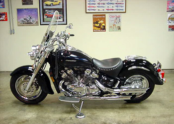 From Jay Reynolds of Anoka MN: "I recently purchased this bike with only 3000 miles on it. It has been real fun customizing it. It features ppg black paint with House of Kolor Pearl Blue ghost flames. Jardine billet front wheel, solid rear wheel disc, chrome cylinder fins, fat T bar, Cobra exhaust. Etc."